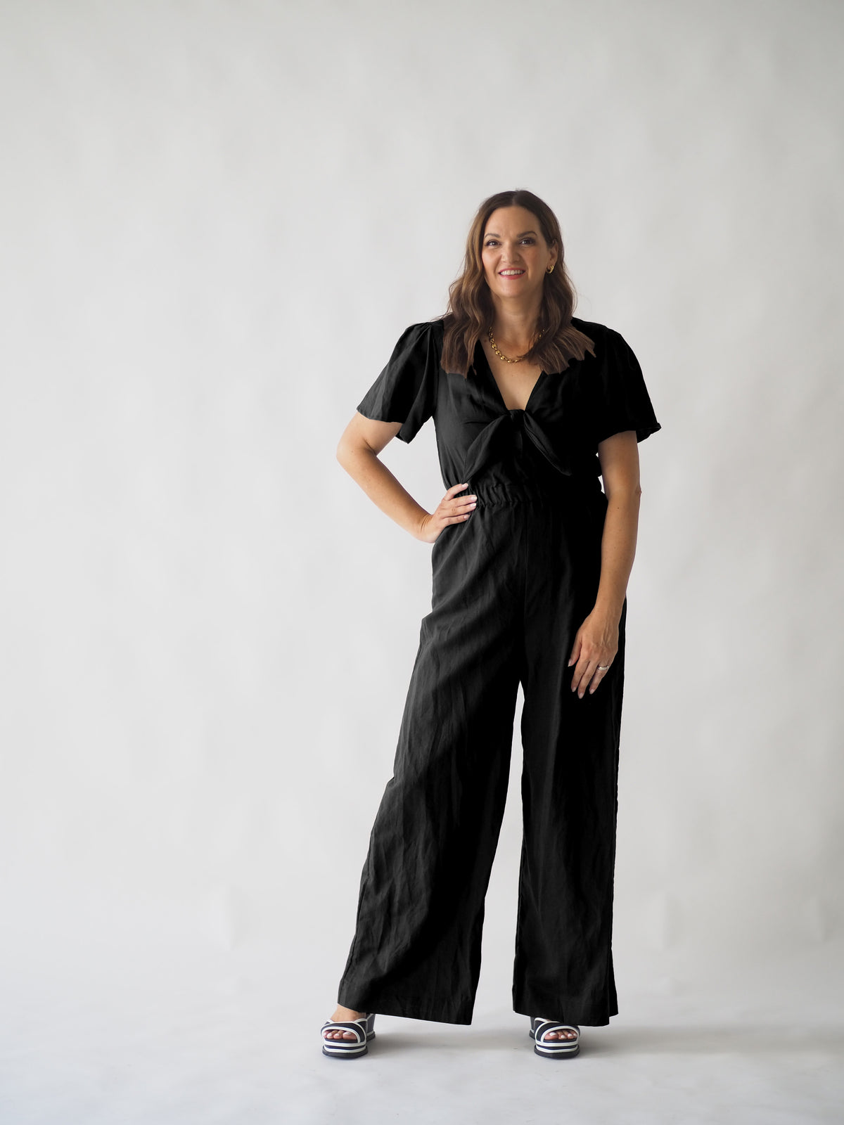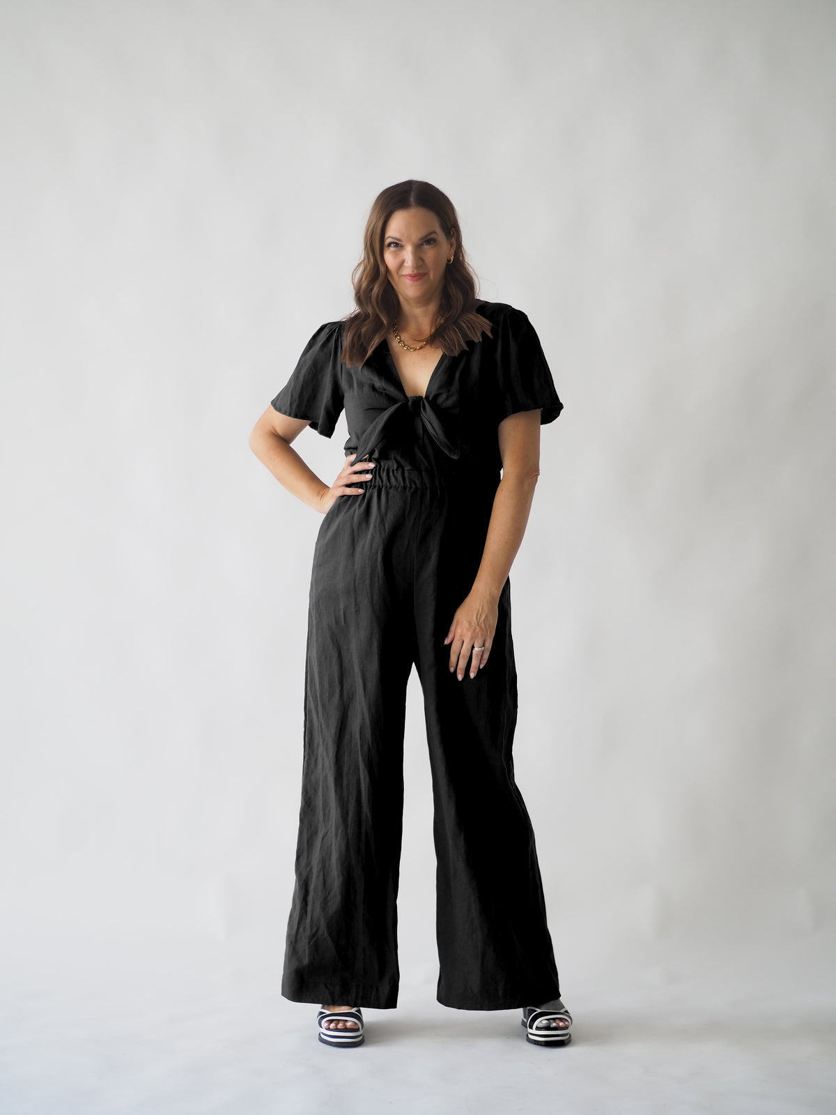 With its bra-friendly front ties, and elastic waistband, the versatile fit of The Jumpsuit makes it a no-brainer.